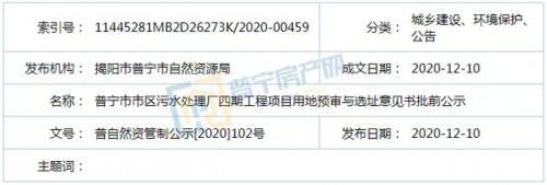 近日,依照《廣東省城鄉(xiāng)規(guī)劃條例》第二十九條規(guī)定,普寧市自然資源局發(fā)布了普寧市市區(qū)污水處理廠四期工程項目用地預審與選址意見書批前公示,具體內(nèi)容如下: