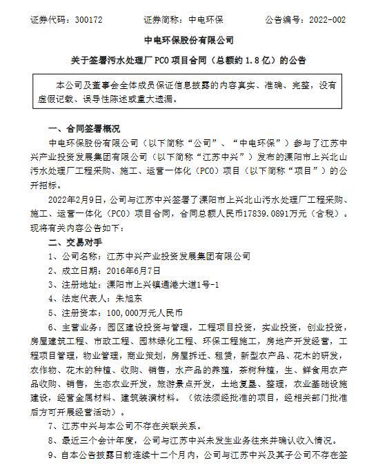 2月9日中電環(huán)保公布,公司參與了江蘇中興產(chǎn)業(yè)投資發(fā)展集團有限公司(“江蘇中興”)發(fā)布的溧陽市上興北山污水處理廠工程采購、施工、運營一體化(PCO)項目的公開招標。